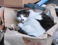 お隣りのビルの非常階段の踊り場をふと見ると、野ざらしになっている段ボールの中に何やら丸まった白い物体が・・・。