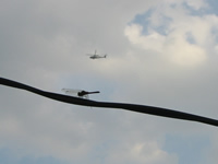 電線に止まったトンボの翅の上を、ヘリコプターの影が通り過ぎました。